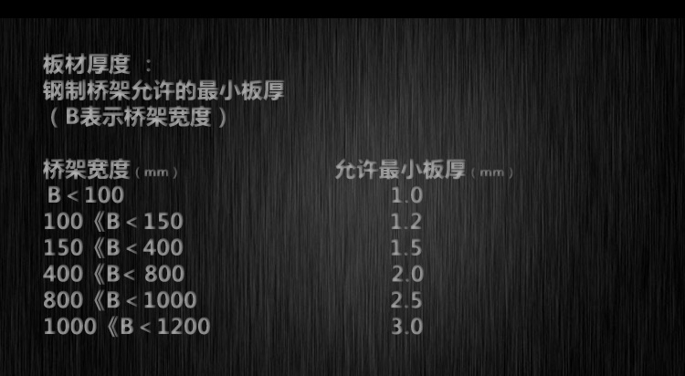 板材厚度:鋼制橋架允許的最小板厚(B表示橋架寬度)
