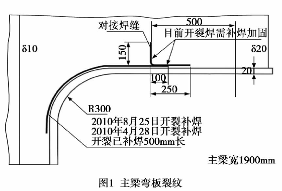 某廠200 /60t - 19m 鑄造起重機于1995 年投入生產(chǎn)( 長期處于高負(fù)荷運行) ,2005 年后該廠產(chǎn)能大幅增加,造成起重機嚴(yán)重超負(fù)荷運行。吊車為A7 工作制,主梁為箱型結(jié)構(gòu),高2500mm,寬1900mm,主腹板厚10mm,副腹板約8mm 厚,上下蓋板約為12mm,主小車車輪共8 個。吊車主梁軌道下設(shè)有370mm 高的T 型鋼,主梁頭部彎板以上至上蓋板腹板高為1200mm,主梁頭部厚板與主梁腹板的接縫至大車軌道約500mm,副腹板在跨中靠轉(zhuǎn)爐側(cè)設(shè)有寬1200mm 的人孔門。橋架開裂主要發(fā)生在兩個部位: (1) 主梁腹板頭部與彎板的焊縫及腹板的對接焊縫出現(xiàn)裂紋,如圖1 所示;( 2) 主梁副腹板進(jìn)主梁的人孔門四角出現(xiàn)裂紋,如圖2、圖3 所示。